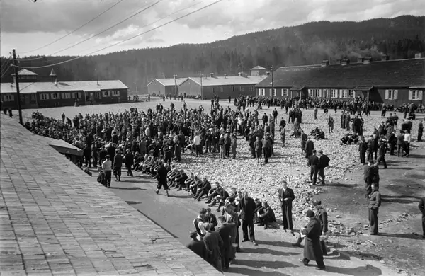 Grinifangene lytter til Churchill over store høyttalere på taket bildet er tatt fra. Rigmor Dahl Delphin (1908-1993) var ansatt som fotograf i ukebladet Alle Kvinner. Hennes negativarkiv ble i 2005 overført Oslo Bymuseum fra Gyldendal Norsk Forlag som var utgiver av bladet.