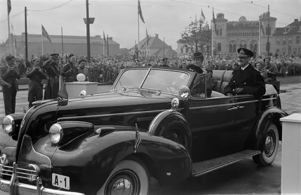 Rådhusplassen, åpen bil A-1, konge, hjemkomst etter krigen, kronprinsesse, tilskuere, bygård, Vestbanestasjonen, Akers mek. Verksted