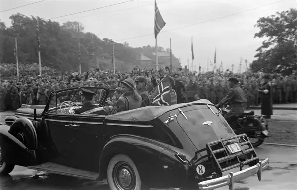 Rådhusplassen, åpen bil, prins, prinsesse, kongens hjemkomst etter krigen, tilskuere