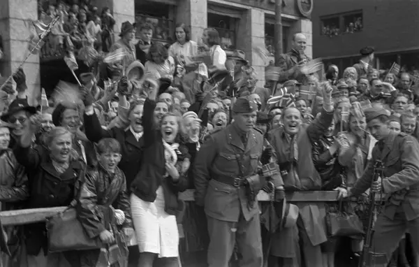 Rådhusplassen, kongens hjemkomst etter krigen, tilskuere, flagg, soldater, kontorbygninger