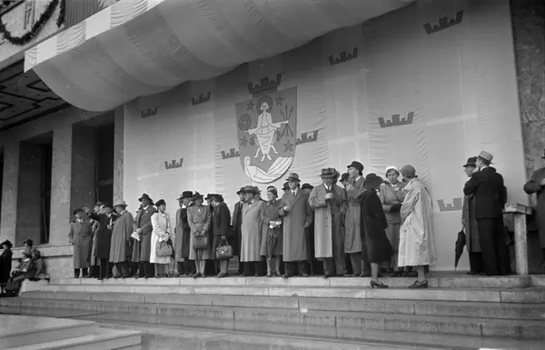 Rådhusplassen, kongens hjemkomst etter krigen, Rådhuset, trapp, tilskuere, banner, kommunevåpen