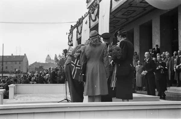 Rådhusplassen, kongens hjemkomst etter krigen, konge, kronprinsesse, prinsesse, Rådhuset, trapp, balkong, tilskuere, ordfører