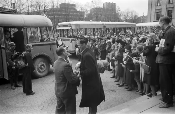 Universitetet, trapp, menn, løslatte Grinifanger, busser, tilskuere, flagg