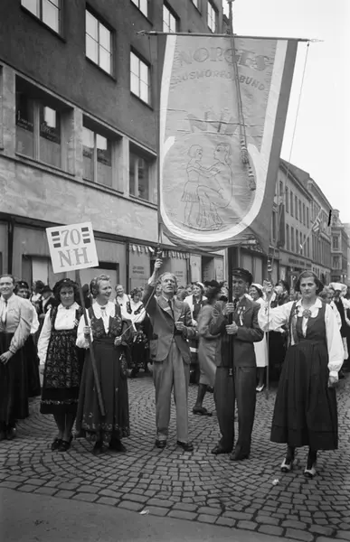 folketog, oppstilling, mennesker, fane: Norges Husmorforbund, forretningsgårder