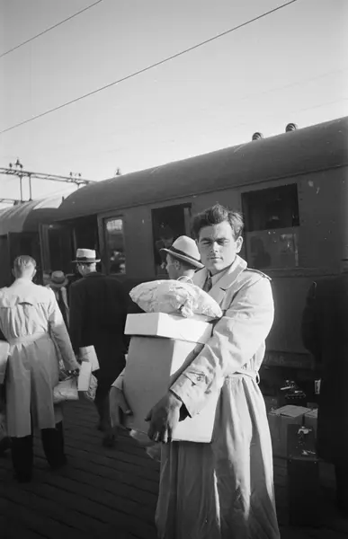 Østbanestasjonen, plattform, mann, student, hjemkomst fra fangenskap i Buchenwald, pakker