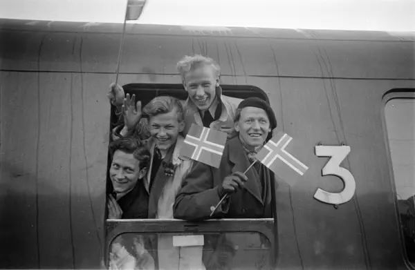 Østbanestasjonen, jernbanevogn, vindu, menn, studenter, hjemkomst fra fangenskap i Buchenwald, flagg