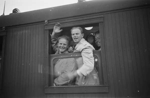 Østbanestasjonen, jernbanevogn, vindu, menn, studenter, hjemkomst fra fangenskap i Buchenwald