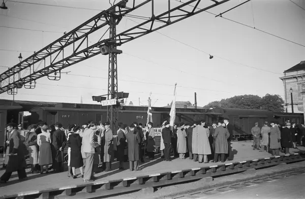 Østbanestasjonen, tog, plattform, mennesker, mottakelse av studenter ved hjemkomst fra fangenskap i Buchenwald