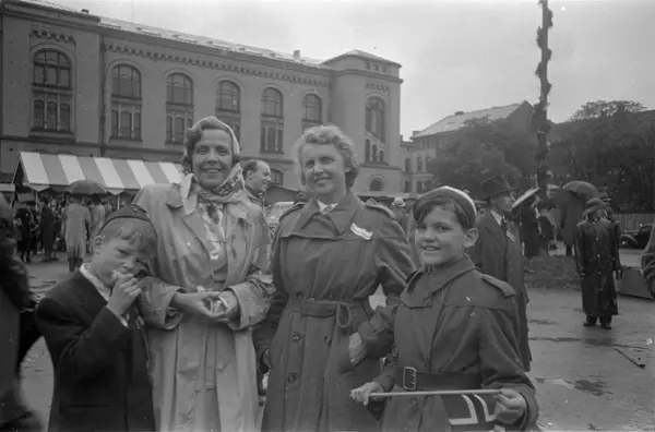 plass, kvinner, gutter, matpakker utdelt av Danskehjelpen etter barnetoget, Historisk Museum
