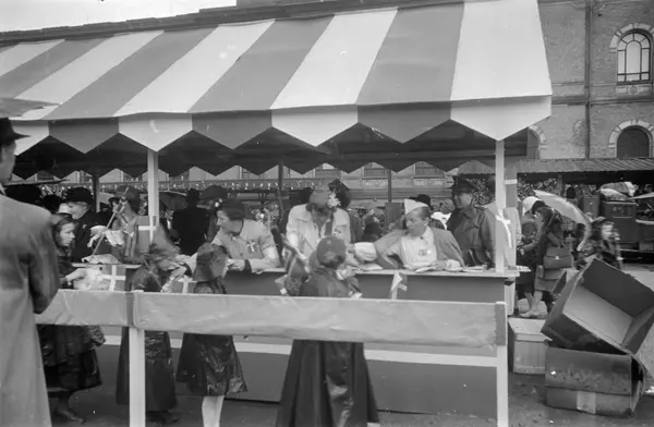 Danskehjelpen, bod, kvinner, utdeling av matpakker til barn etter barnetoget, lastebil, Nasjonalgalleriet