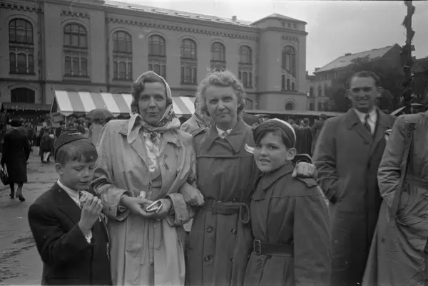 plass, kvinner, gutter, matpakker utdelt av Danskehjelpen etter barnetoget, mann, Historisk Museum