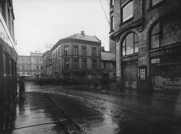 gateløp, forretningsgårder, hotell Børsen, Østbanestasjonen, mennesker, regnvær