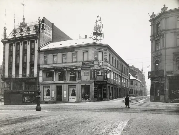 gatekryss, forretningsgårder, konditori, lysreklame, gatebelysning, Fru Byes hotell, hotell Ringerike