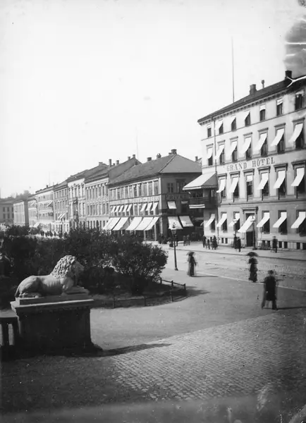 løveskulptur, Grand Hotel, forretningsgårder, mennesker