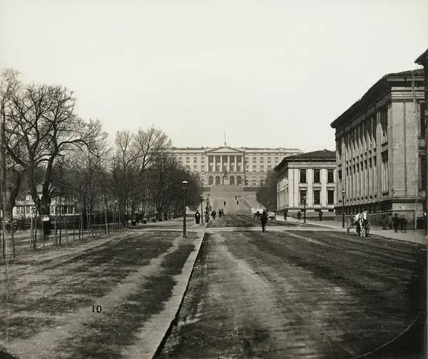 gateløp, park, Fritzners paviljong, serveringspaviljong, Slottet, Universitetet, mennesker, hestekjøretøyer, gatebelysning