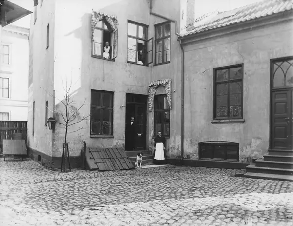 bygård, gårdsinteriør, kjellerlem, kvinner3, mann, hund