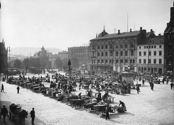 torg, torghandel, mennesker, portrettstatue, forretningsgårder, pissoir, trikker