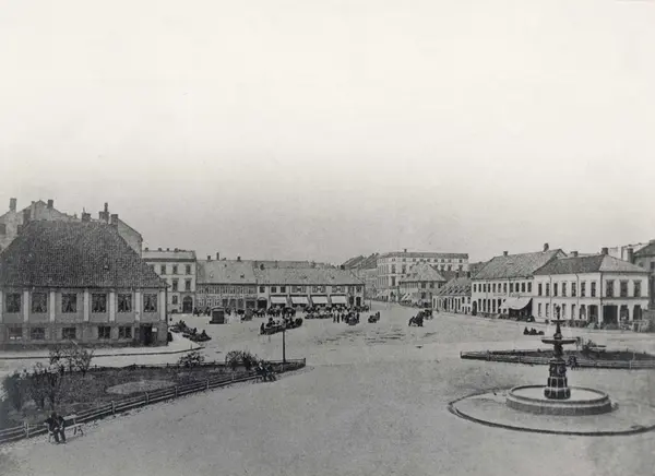 park, springvann, bygårder, torg, mennesker, hestekjøretøyer