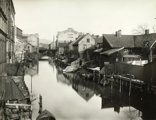 elv, småbåter, trehusbebebyggelse, bygårder, gavlreklame, Hausmanns bru