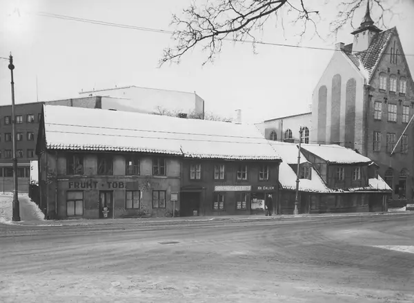 bygårder, skoreparasjonsverksted, bussholdeplass, Grønland menighetshus, snø