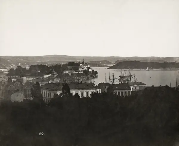 utsikt vest, bygårder, havn, seilskip, Akershus festning, fjord, øyer