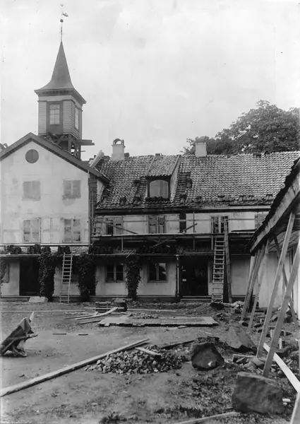 Bygningene på Frogner hovedgård ble istandsatt av kommunen i 1911–12. Svalgangene og deler av tårnet ble fornyet og murpussen utenpå bindingsverket ble fjernet. På dette fotografiet er veggene fremdeles hvitkalket, slik de fra begynnelsen var ment å være, for å se ut som murvegger.