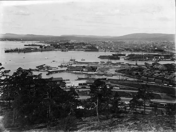 utsikt, furutrær, havn, seilskip, Nylands verksted, bordtomter, Akershus festning, Slottet