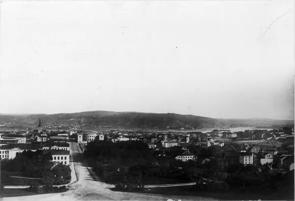 utsikt øst, plass, gate, park, Universitetet, bygårder, Stortingsbygningen, Vår Frelsers kirke, Alunverket, Akershus festning