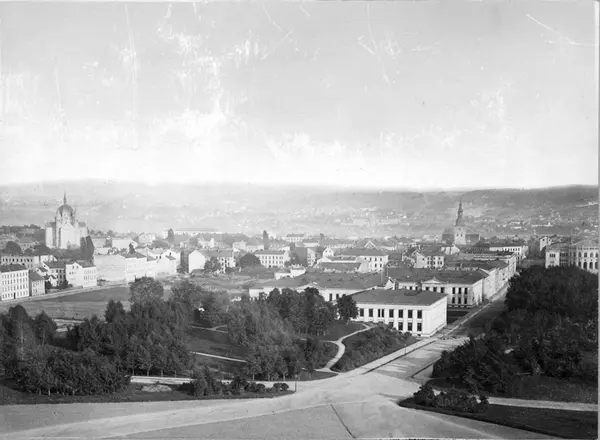 utsikt nordøst, park, Universitetet, løkke, bygårder, Trefoldighetskirken, Vår Frelsers kirke, gateløp, Stortingsbygningen
