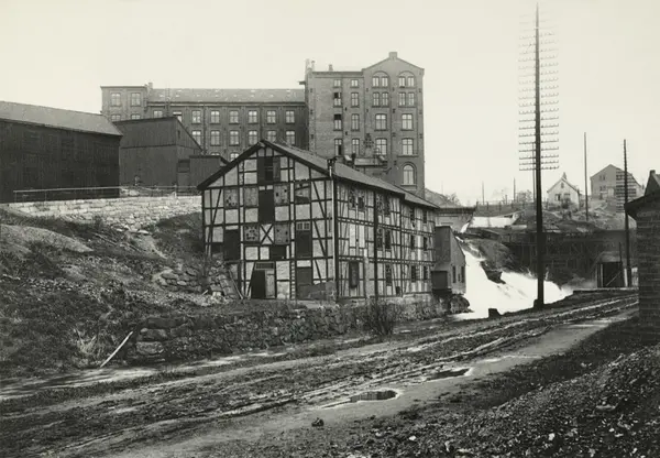 Våghalsen barkestampe, bindingsverk, Graahs spinneri, fabrikkbygninger, elv, foss, "Hønse-Lovisas hus"
