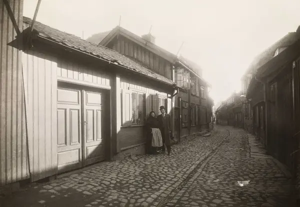 gateløp, trehusbebyggelse, brostein, rennestein, mann, kvinne