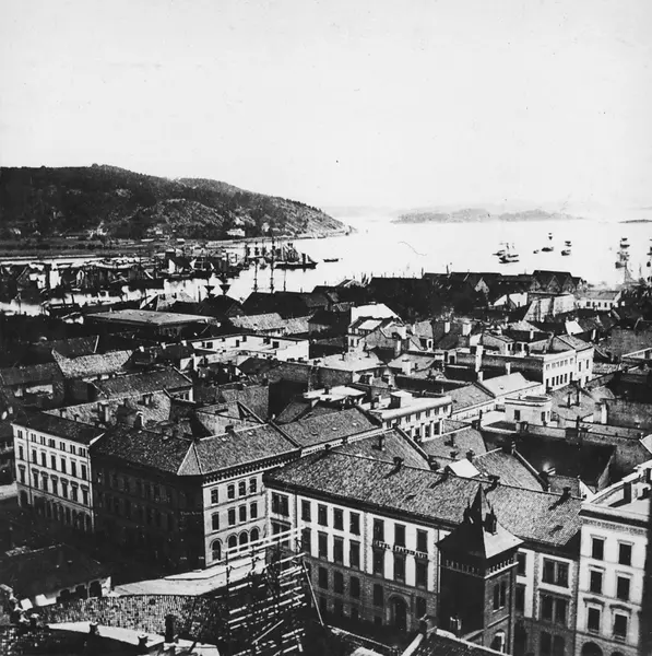 utsikt, brannvakten, bygårder, fjord, seilskip, Alunverket