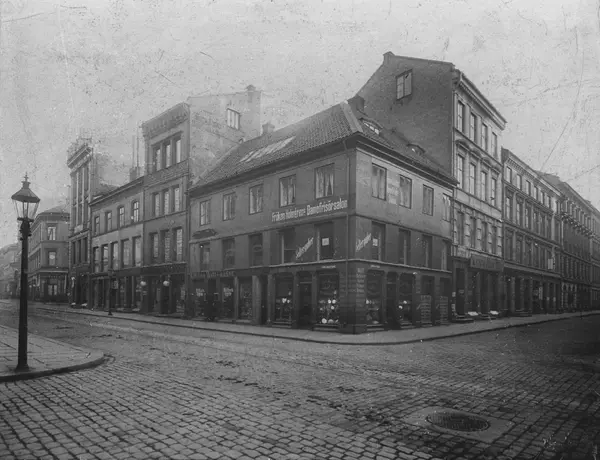 forretningsgårder, hjørnegård, hattemaker M. Olsen, frøken Holmgrens damefrisørsalong, Wolffs parfymeri, gatebelysning, gatalegeme, brostein