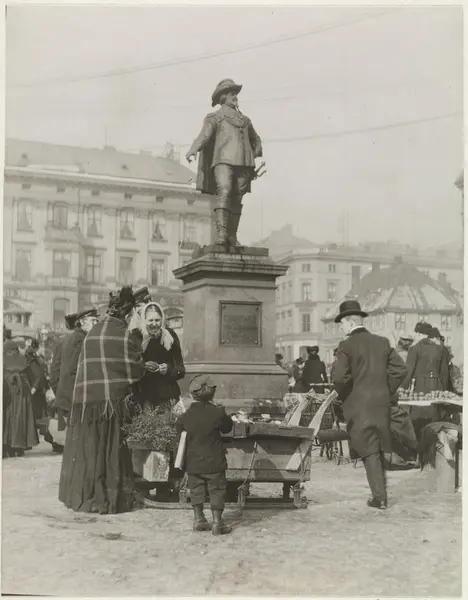torg, mennesker, torgkoner, kunder, torghandel, portrettstatue, forretningsgårder