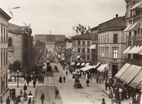gateløp, keiserbesøk, æresportal, hestekjøretøyer, hestesporvogner, gateliv, Stortingsbygningen, forretningsgårder, markiser, Slottet