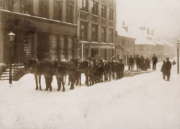 gateløp, forretningsgårder, hester, snøplog, menn, snørydding