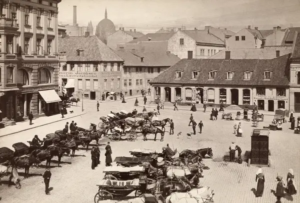 torg, mennesker, hestekjøretøyer, pissoir, bygårder