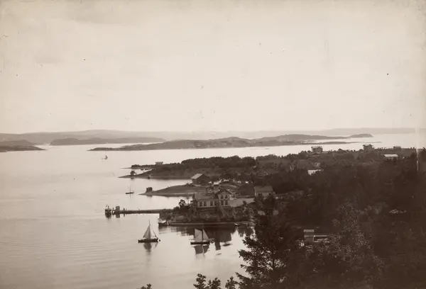 utsikt, fjord, seilbåter, kulturlandskap, villabebyggelse, badehus, skog