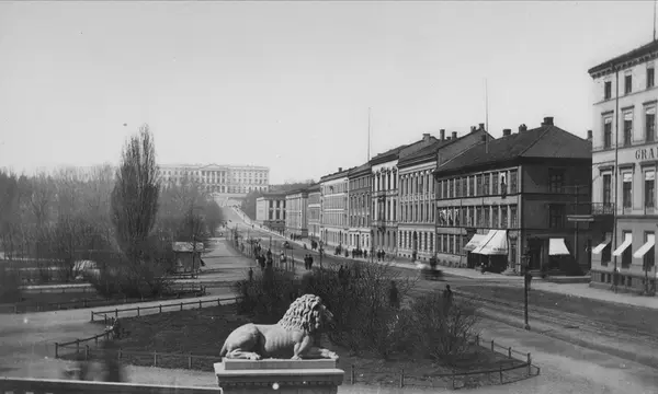 gateløp, løveskulptur, park, Grand Hotel, Søstrene Larsens hotell, forretningsgårder, mennesker, Slottet