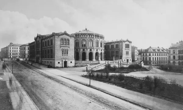 utsikt, Stortingsbygningen, løveskulpturer, park, bygårder