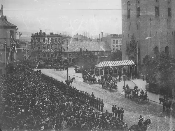 Oscar IIs regjeringsjubileum, opptog, hestekjøretøyer, publikum, bygårder, flagg, girlander, Vår Frelsers kirke