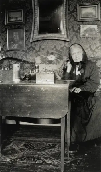 Edvard Munchs tante Karen Bjølstad (1839-1931) lytter på radioen hun fikk av sin nevø. Bildet er tatt på Nordstrand i villa Punktum, Ole Moes vei 2, der Karen døde. Edvard Munchs maleri "Natt i Saint-Cloud" (1893) henger til venstre på veggen bak henne. Inger Munch, søster av Edvard Munch, testamenterte ved sin død i 1952 ca 200 negativer til Oslo Bymuseum. Blant dem negativene til de fleste bildene i hennes bok "Akerselven", utgitt i 1932.