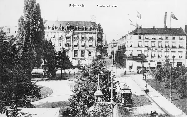 gateløp, plass, park, trikk, mennesker, kiosk, Grand Hotel, Hotel Nobel