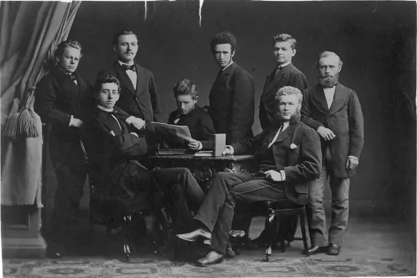 Sittende ved bordet med avis: Einar Leschly Hansen Sundt. Stående til høyre for ham: Mauritz Elizar Andresen Hansen. Helt til høyre Emil Rode. Ellers skal Harald Rode, Karenus Frederik Fabricius og Carl Schou være blant de avbildede.