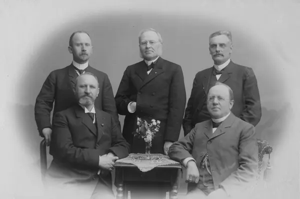 Bak fra venstre: Axel Smedal, Sigvald Blaker og Halfdan Raabe. Sittende: Eugen Karl Holtan og August E. Eliassen.