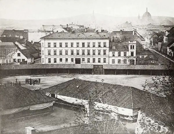 utsikt, ridebane, ekserserplass, mennesker, brakker, bygårder