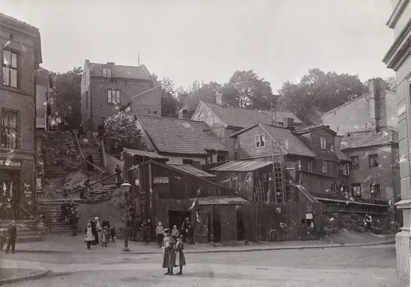trehusbebyggelse, bygårder, trapp, mennesker, gateliv, kull- og vedutsalg, fiskeutsalg