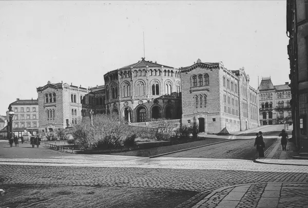 Stortingsbygningen, park, bygårder, gate, brostein, mennesker