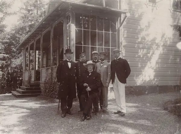 kongevilla Victoria, glassveranda, trapp, gårdsplass, gruppe, menn6, konge, hatter, uniformer