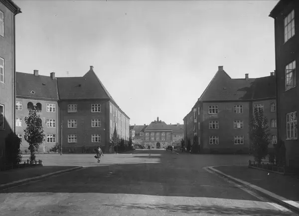 Torshov boligkompleks, bygårder, forhager, plass, gateløp, kvinne